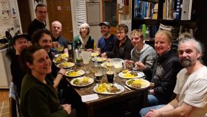 While all this was happening on the cliffs of Creag Meagaidh, back in the hut, tatties were being peeled, neeps were being mashed and haggis gently boiled. We mustn’t forget about the sprouts though, a recent non-traditional addition that has found its way on to the JMCS Burns Supper menu in recent years. Some say they provide additional atmosphere to the evening, though I suspect their full effect would only be properly appreciated the following morning. Anyway, by the wonders of modern communications the Staghorn Gully team WhatsApped us to say they were a bit delayed and would be at the top of the climb by 5:30 and at the car park by 8pm. And they’d be bringing a couple of guests for tea. Some ungenerous souls suggested that we should just have the soup and not let on that there was any. This was vetoed. We did however manage to make short work of the salsa and tortillas which wasn’t mentioned to the latecomers. We passed the time by playing cards, stoking the fire, spoiling our appetites with nibbles and an impromptu fiddle and whistle recital by the 2 resident musicians.