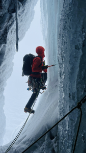 By this time, the cave was becoming rather crowded. An offer to take over the lead of the final pitch by a climber who had been patiently waiting in the queue was quickly accepted. He led over the crux to the final stance on the ridge which led to the plateau. There were still nine in the cave and it was after 4pm. It made sense to join forces and get everyone to the top as quickly as possible. The ‘caterpillar’ was quite an operation. Stories and banter were exchanged by those waiting as one by one, and two by two, climbers were roped up the final section. Above, the first 2 to arrive took control of what can only be described as the ‘belay machine’ – a well-oiled one at that. It was a marvel to behold. Meanwhile, others were put on rope coiling duties, the results of which were less than perfect due to tiredness and cold. From there, it was an easy solo to the plateau. Thankfully, there was no cornice to contend with.