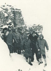 It was a full house. Whether this was down to the promise of fine dining and entertainment or the reported good conditions on Creag Meagaidh is unclear. Plans were made, groups were formed and the climbers were away at sparrow fart the next morning, heading for Meggie. The others enjoyed a more relaxed start before heading in the same direction but with lesser ambitions. The carpark was rammed. I’ve never seen so many cars there before. A sign of the times and probably something to do with some elite climbers waxing lyrical about the best conditions on Meggie for years a few days earlier. We shoe-horned our cars into what little space we could find, and enjoyed a pleasant walk up to Coire Ardair. The non climbers were on an archaeological mission, intending to try to find the site of the old JMCS Meggie Hut in the Coire. Attempts to find this had failed in previous years, but armed with better beta, some photographs and steely determination, we were hopeful of a better outcome this time. We reached the huge, obvious boulder below Raeburn’s Gully where the old MR box is still located and started to scout around for obvious looking boulders. A likely looking candidate was spotted a few hundred meters uphill from where we were and an advance party stumbled towards it in the deep snow. The wise stopped for first lunch in case this was a wild goose chase. As it happened, we hit gold first time, finding the site of the old hut. Little remains – some concrete (the door step?), some evidence of a built-up wall and a few rusty wall hangers that used to support the roof on the boulder that formed the back wall. Some pictures were taken, lunch was had and we wondered at the effort and shifts that our predecessors put in to build this howff. The cloud was down, it was late in the day and there was little enthusiasm to venture higher so we returned to the hut to prepare the meal and await the climbers. Little did we know how long that wait would be.